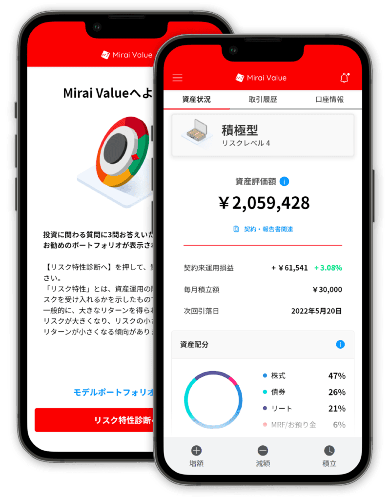 ミライバリューは、Quantifeedの技術を活用することで、高度な金融知識がなくても、プロが運用する分散されたポートフォリオを投資家に提供します。当社は、ミライバリューの「最先端技術に支えられたウェルスアドバイス」をコアサービスの一つとして位置づけ、若い世代の経済的なミライをサポートしていきたいと考えています。